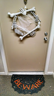 Here is a skeleton wreath I made last year for Halloween. Since we live on the third floor with an indoor corridor, no one really sees it, but it makes me happy all the same. Made with plastic skeleton pieces, wired over a burlap wrapped wreath form. Fake spider webs added for funsies.